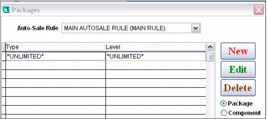 In a pay-upon-return process, the rental package configuration (also referred to as the rental contract item) is very simple. It consists of creating a rental package that uses the *UNLIMITED* rental component. In order to generate the auto-sale of the appropriate modifiers based on rental activity, the appropriate Auto-Sale Rule is also selected. As many rental contract items as necessary may be configured based on variances in Auto-Sale Rules per rental shop.