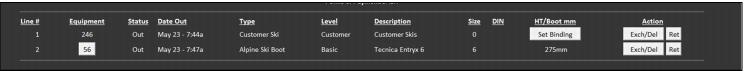 Note: If one “customer ski” per binding manufacturer is configured (the binding manufacturer is selected for each customer ski within the inventory), the tech needs to scan the customer ski barcode that corresponds to the binding mounted on the guest’s equipment. Scanning a “customer ski” barcode that is already configured with a binding manufacturer eliminates the step of manually selecting a binding manufacturer at the TechStation in this particular situation.