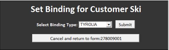 In order to calculate DIN settings for customers who own skis, scan the equipment barcode configured for the Customer Ski equipment inventory record (see Special rental inventory items). The Customer Ski inventory item is added to the rental contract and the rental tech clicks the Set Binding button in order to select the binding manufacturer for the bindings mounted to the customer skis. Once the binding for the customer ski is selected and a boot is attached to the rental contract, the DIN setting is calculated for the guest.