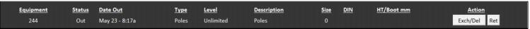 To rent just poles to a customer (or any piece of rental inventory that is not specifically tracked with unique barcodes), scan the equipment barcode configured for the Poles equipment record (see Special rental inventory items). To return the poles, just look up the customer’s rental contract and click the Ret button next to the Poles item.