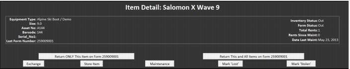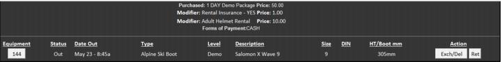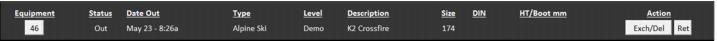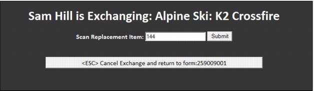 If the new equipment is already checked-out (the equipment was never officially returned from the last rental) or does not match the level or type of the package purchased by the guest, the exchange fails and the tech is notified about why the exchange is not possible (already checked-out, guest did not purchase that type or level of equipment, due for maintenance, etc.)