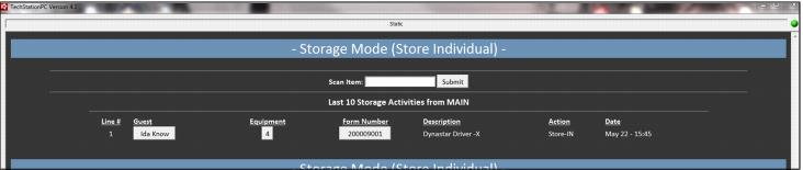 Equipment can also be stored by entering Store Mode on the TechStation. In this mode, either just the item scanned is put into storage or all items associated with the form can be put into storage. It is also possible to generate a label for each piece of equipment stored while in Store Mode. The auto-printing and type of store mode can be set per TechStation by modifying the appropriate settings found on the Ready form.