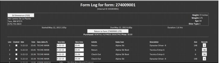A full history of rental activity associated with a Rental form may be viewed by clicking the Form Log button while viewing the Rental form. This form log can be edited; dates and times of actions such as check-outs and returns may be altered. Changing this information requires that a password is entered. Editing the form log is typically not important in pay-up-front rental shops, but becomes a critical piece of functionality in pay-upon-return rental shops in order to adjust the rental times and dates that generate charges for customers.