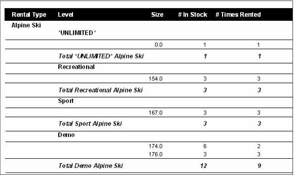 The Equipment Utilization Report provides a snapshot of the number of rentals in stock per type/level/size vs. the number of times those type/level/size combinations were rented during the specified date range. This report can be helpful in determining the most popular size and equipment type/level rentals used at a rental shop.
