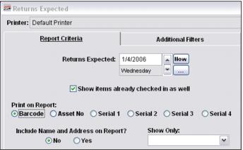 The Returns Expected Report can be used to generate a list of equipment that is due on or before a particular date. It can also show those items due back on the date specified that have already been returned in order to provide a “big picture” of the total returns expected compared to the total number already returned.