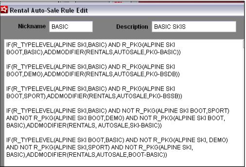 • The first line says, if the inventory attached is a type and level of ALPINE SKI, BASIC and there is also an ALPINE BOOT, BASIC piece of inventory attached to the form, add the Basic Ski Package modifier (the RENTALS, AUTOSALE, PKG-BASIC item).