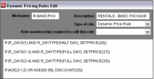 • The first line says if the number of rental days = 1 and the type of day is HALF DAY (these are from our Days definitions we set during the Rental Auto-Sale Rule configuration), set the per day price to $20.