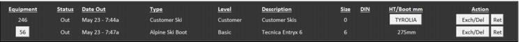 Special rental inventory items). The Customer Ski inventory item is added to the rental contract and the rental tech clicks the