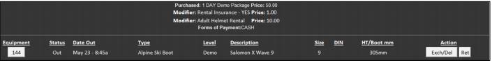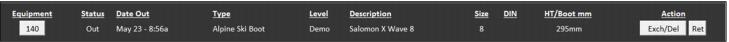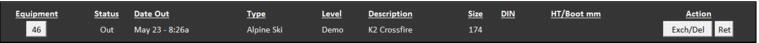 If the new equipment is already checked-out (the equipment was never officially returned from the last rental) or the guest already has equipment of that type checked out, the exchange fails and the tech is be notified about why the exchange is not possible.