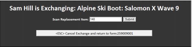 1. Scan the Rental form and click the Exch/Del button next to the item to be exchanged. Scan or hand-enter the new piece of equipment and click Submit.