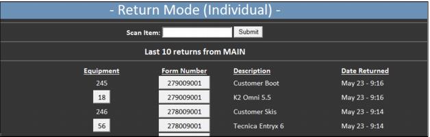 1. Scan the Rental form and click the Ret button next to the item to be returned.