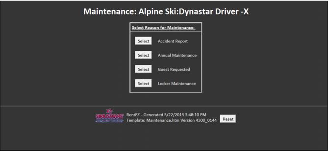 Equipment can be placed into maintenance by scanning the equipment needing the maintenance and selecting the Maintenance option. The type of maintenance must then be selected. Various reports such as the Rental Maintenance History Report can be used to gather data regarding what equipment has been put into maintenance and the reason for the maintenance.