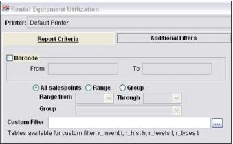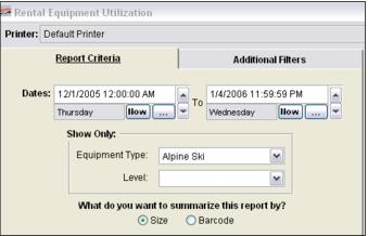 The Equipment Utilization Report provides a snapshot of the number of rentals in stock per type/level/size vs. the number of times those type/level/size combinations were rented during the specified date range. You can also summarize the report by additional fields such as Asset Number and all four Serial Number fields. These values are also available to print on the report as well. This report can be helpful in determining the most popular size and equipment type/level rentals used at a rental shop.