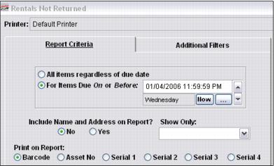 The Not Returned Report provides a list of equipment that has not been returned. A specific due date may be set in order to capture all of those rentals that were due on or before a certain date or the report can be run for all rentals not returned regardless of the due date. Guest names and addresses may be included on the report. Due date, time and Rental Shop description is also included in the report body.