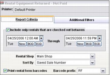 The Equipment Returned – Not Paid Report is very useful in pay-upon-return rental shops as it helps identify those contracts (Rental forms) where all equipment has been returned but the rental charges generated for the rental activity have not been paid. This report can also include a Rental form barcode for easy recall of the associated sale/reservation within the Sales application.