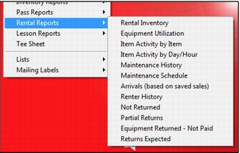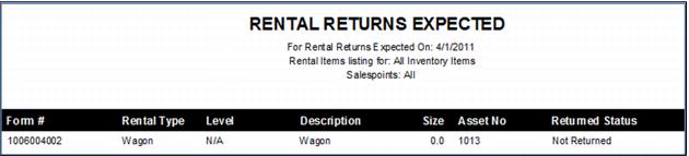 Standard Rental Reports can be used to gather data on the inventory activity. For instance, to see all inventory that is due at the end of the day but has yet to be returned, run the Returns Expected Report.