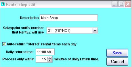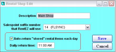2. In SysManager, edit the rental shop where the items are stored and check the Auto-return “stored” rental items each day check box (if not already checked) and set up the appropriate Daily return time. A record is created in the autotask table after the rental shop editing (above) is saved.