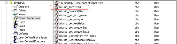 3. In Enterprise Manager, make sure that the siriussp_AutoTasks exists in the Stored Procedures folder under the SiriusSQL database.
