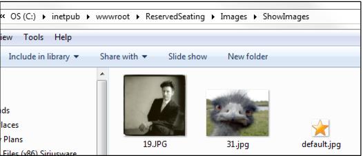 It is possible to display a picture relating to a Show on the schedule. To do so, find a small .JPG file and name it with the ShowID. Save the file in the \Images\ShowImages folder in both the E-Commerce and Reserved Seating directories installed under IIS. If no show image matching the ShowID is found, a default picture is displayed. Please ensure to have at least one image file named default.jpg located in the ShowImages folders.
