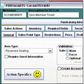 1. Start by selecting Reserved Seating for the Item Type on the Action tab. By default, Reserved Seating module items do not require guest information, but guest information can be required at the time of the sale, by checking the Require Guest Information check box.