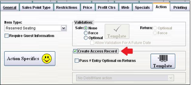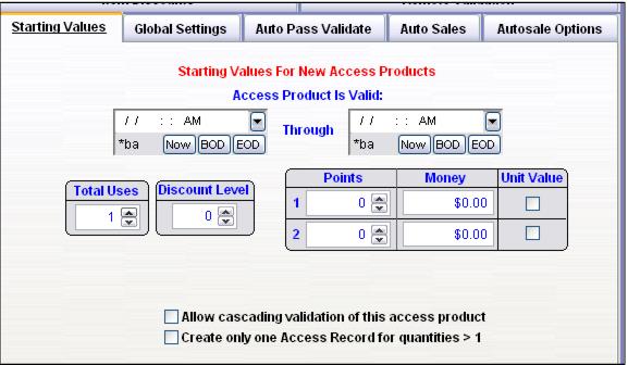 Note: A typical Access Template configuration for a Reserved Seating item would include 1 (positive one) Total Use for Starting Values, -1 (negative one) Total Use for Auto Pass Validate and Don’t Use Shifts for Autosale Options.