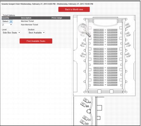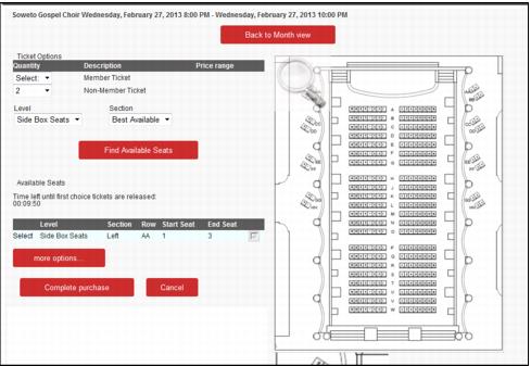 6. The system returns “the best available” seat block, but to see additional blocks click the More Options… button. If no seats are available, users receive a message detailing the lack of tickets.