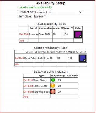 This tool can be accessed from SysManager > Activities > Reserved Seating > Production & Show Configuration > select the desired production > Productions edit screen and clicking on the Availability Setup button that opens a web-based window that allows venue administrators define Level and Section Availability Rules as well as the Seat Availability indicator images for that production.