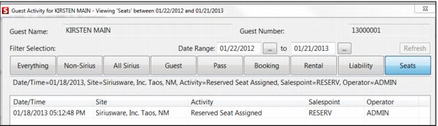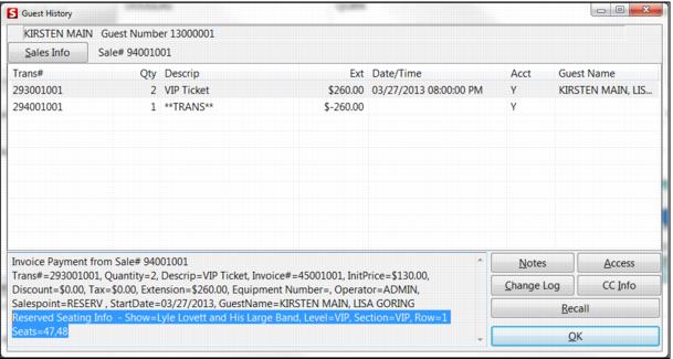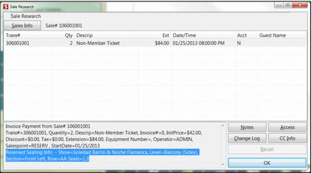 • Sale Research, convenient when a guest is not associated with the sale, displays the seating information after drilling into the sale details.
