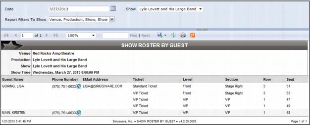 Provides a listing of guests booked into seats for a given show. If a guest is not directly attached to a ticket item, the Reservation Header guest and/or Saved Sale guest is identified as the guest for all seats included in the sale/reservation.