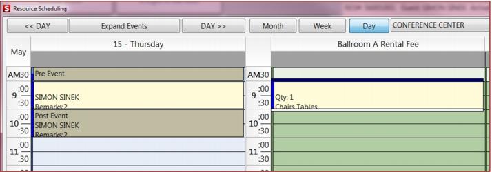 When an operator books an event, the booking automatically expands to include the setup/breakdown minutes based on the defaults for the Event Type or revised times as established in the Reservation Header. The setup/breakdown portion of the event booking is displayed visually in a different color than the arrival and departure times for the reservation on the Resource Scheduling booking dialog.