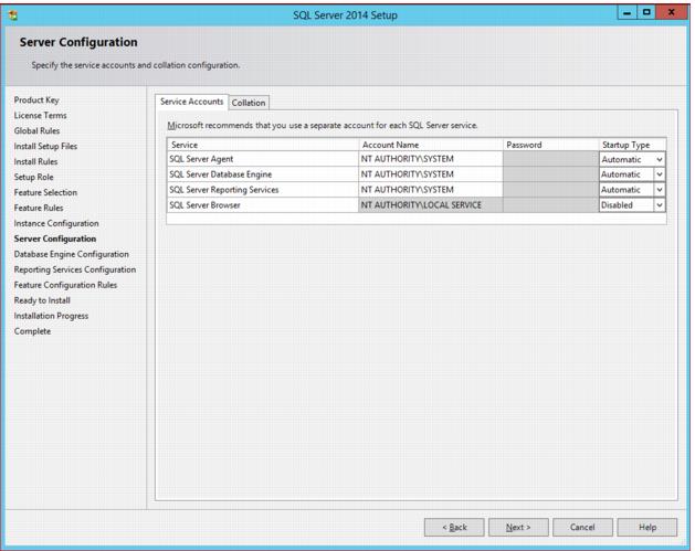10. Server Configuration: Change the account name to NT AUTHORITY\SYSTEM and the Startup Type to Automatic for the SQL Server Agent, SQL Server Database Engine and SQL Server Reporting Services.