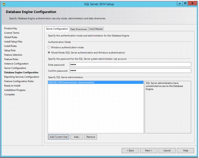 11. Database Engine Configuration: Choose Mixed Mode for the Authentication Mode. Specify a password for the SQL Server System administrator (sa) account. Add at least one additional Windows user, normally your domain administrator. If you wish to change the default location for the database and log files, click the Data Directories tab and specify the paths accordingly.