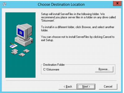 6. You are presented with the following dialog. Accept the default installation directory (C:\Program Files x(86)\Siriusware) unless you have good reasons to place it elsewhere. Click Next.