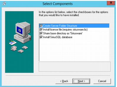 7. You are presented with the following dialog. Un-check Install license file (requires siriusware.lic) if you are installing a new, “clean” SiriusSQL database or if you are installing an existing SiriusSQL database and you don’t have the license file. Leave the other options checked.