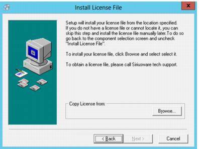 8. If you selected Install license file (requires siriusware.lic) in the previous step, you are presented with the following dialog. Click Browse and navigate to the SiriusTEMP directory (though you are probably already in that directory by default). Select the Siriusware.LIC file and click Open. Then, click Next to move on to the next dialog.