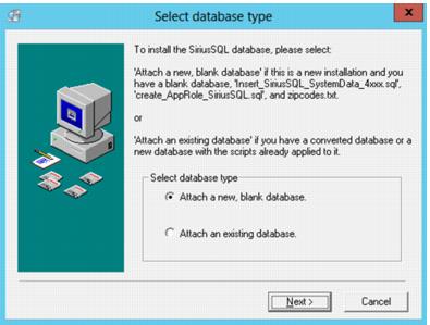 10. You are presented with the following dialog. Select whether you are attaching a new, “clean” SiriusSQL database or an existing SiriusSQL database. Click Next.