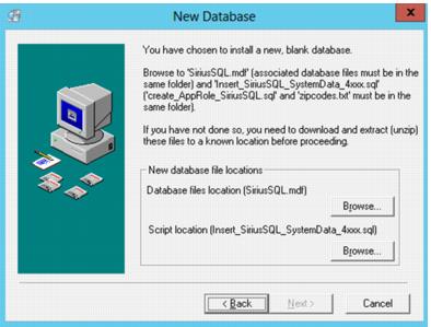 11. If you selected Attach a new, blank database in the previous step, you are presented with the following dialog. Click the Browse buttons and navigate to the SiriusTEMP directory (though you are probably already in that directory by default). Select the SiriusSQL.mdf file click Open. Then, select the Insert_SiriusSQL_SystemData.4xxx.sql file and click Open. Then, click Next. The installer attaches the database to your SQL Server.