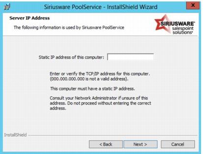 5. You are presented with the following dialog. Type in the static IP address of the computer on which you are installing Pool Service. Do not use 127.0.0.1 unless all Salesware software is being installed on one computer only (very unlikely). Click Next.