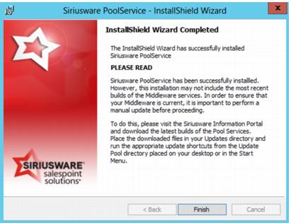 8. When Pool Service completes, you are prompted to check for updates to Middleware. Follow the instruction given in the following screen capture, and then click Finish.