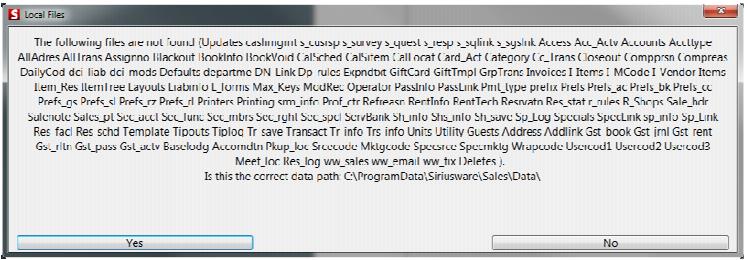 You get a message indicating that files are not found (see the following screen capture). Sales must load them from the server (that is, Sales must create the local data files in the \ProgramData\Siriusware\Sales\Data folder). Click Yes and the salespoint begins to build the file structure for the first time. This can take a few minutes depending on the size of the data set.