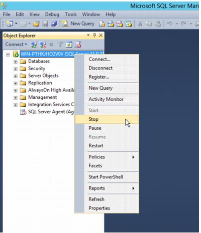 1. First, make of copy of your “live” database. But before you can duplicate it, SQL Services must be stopped. To do this, open Microsoft SQL Server Management Studio and log in. Right-click on the SQL server name and select Stop.