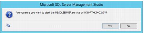 6. Open the Microsoft SQL Server Management Studio application and right-click on the SQL server stopped previously. Select the Start option. You are prompted to confirm that you do in fact want to re-start the server.