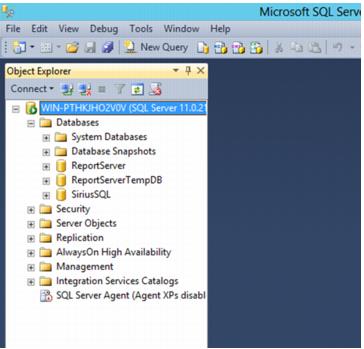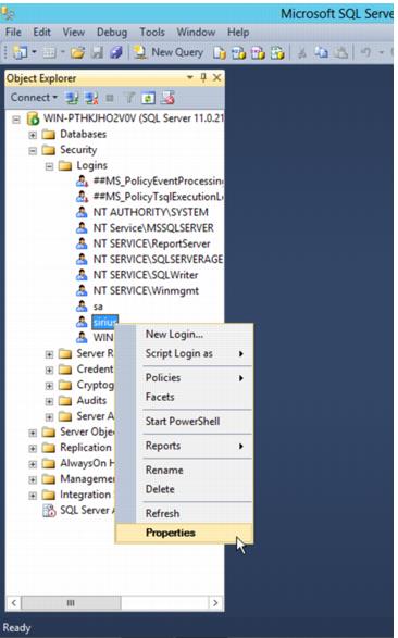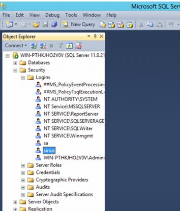 11. The last step is to give the user sirius access to the newly installed database. In Microsoft SQL Server Management Studio, expand Security on the left side of the screen and then expand Logins. You see the user sirius listed.
