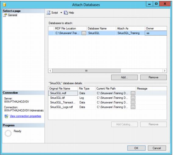9. The Attach Databases dialog opens and prompts you for the location of the database files. Click Add to browse to the location of the duplicated database files that reside in your newly created Training Data folder and select the SiriusSQL.MDF file. Click OK.