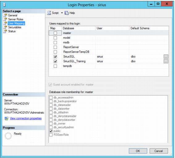 13. Click User Mapping and ensure that there is a checkmark in the Map column next to SiriusSQL_Training. (You now have checkmarks for both Siriusware databases, allowing this one user access to both databases.) Click OK.