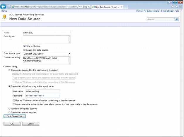 7. The Connect using section deals with the authentication used to access the data in the SiriusSQL database. Generally, Siriusware Inc. recommends that clients or, more specifically, the server administrator, create a (secret) SQL log-in specifically for ad-hoc reporting that is granted the db_datareader role in the SiriusSQL database. Select Credentials stored securely on the report server and enter the appropriate username and password.
