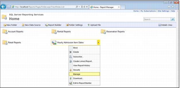 1. From the Home page (or the page on which the desired report is displayed), hover over the report name, click the dropdown arrow, and then select Manage.