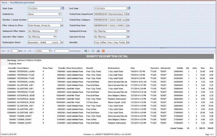 A report that details benefit redemption activity with subtotal options for pass DCI, guest, benefit, redemption item or no subtotals between given date range. This report can be used to easily export all redemption data.