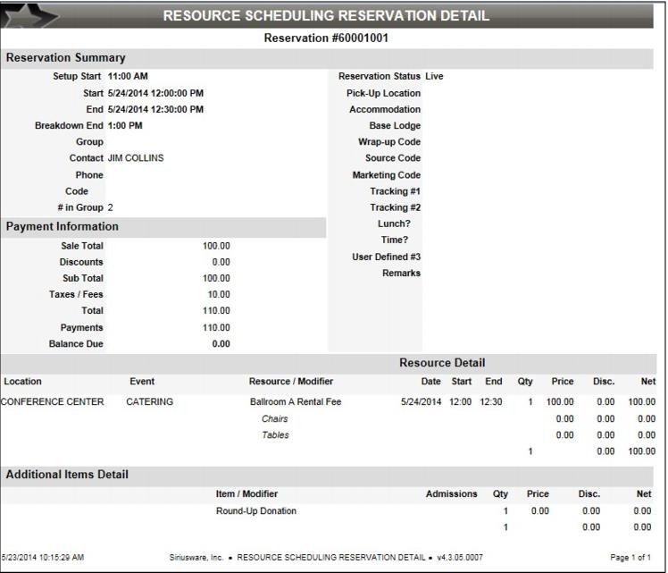 This report details all information available for a Resource Scheduling reservation, including contact information, Reservation Header details, payments made, resources reserved and additional items purchased. Only reservations entered into our Resource Scheduling module are included.