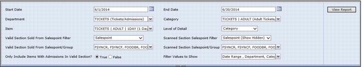 This report works similarly to the Valid and Scanned Admissions by DCI Report. However, instead of reporting based on DCI, the report illustrates Admissions broken out by specific date. The salespoint filter for the Valid section applies to the salespoint from which the valid product was originally sold. The salespoint filter for the Scanned section applies to the, “salespoint” from which it was scanned (scanners and gates are considered salespoints). The new Salespoint (Show Hidden) option allows the ability to view/select hidden salespoints in the report. An additional new filter has been added to only include items in the valid section that have admissions recorded in the transact table.